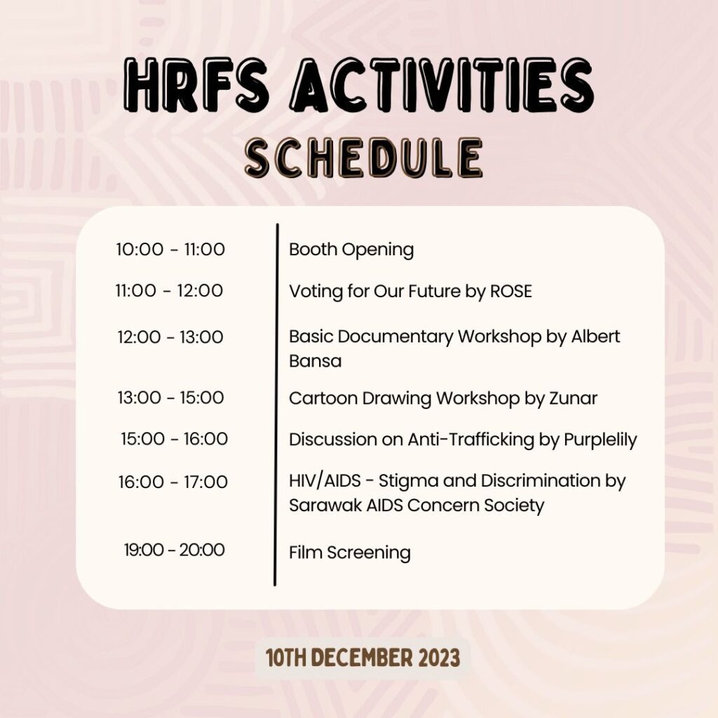 Orang ramai dijemput hadir ke ‘Human Rights Festival Sarawak / Sambutan Hari Hak Asasi Manusia Peringkat Negeri Sarawak 2023 (HRFS 2023)‘ pada 9 & 10 Disember 2023, hari Sabtu dan Ahad, yang bertempat di Dewan Pameran Aras 1, La Promenade Mall, bermula dari 10am hingga 9pm. Acara ini merupakan anjuran bersama oleh beberapa pertubuhan bukan kerajaan (NGO), dan pertubuhan masyarakat sivil (CSO) Sarawak.
