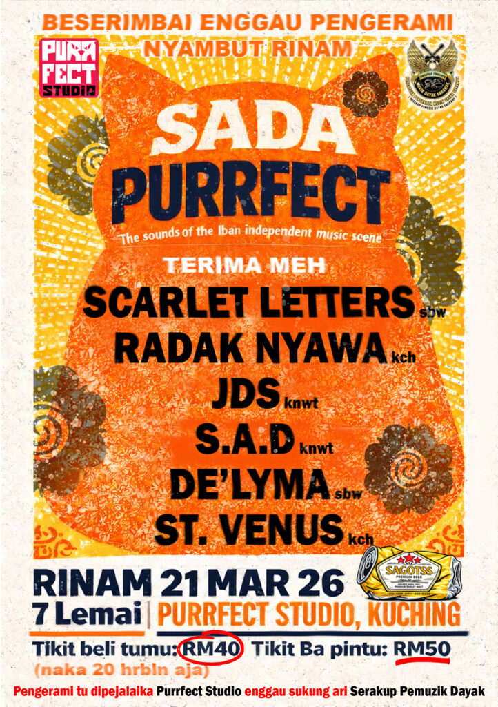 Ruang acara Purrfect Studio bakal di gegarkan dengan komuniti muzik Iban, dimana sebuah gig bernama ‘Sada Purrfect‘, yang akan menghimpunkan 6 buah band Independent Iban yang akan berkongsi pentas bersama. Gig ini akan berlangsung pada 21 March 2026 (Sabtu) bermula dari jam 7.00pm sampai habis. Ini bukan sekadar sebuah gig, tetapi meruapakan sebuah gig yang meraikan bunyi, semangat dan solidariti untuk scene muzik Iban yang semakin berkembang dan tumbuh bagaikan cendawan.
