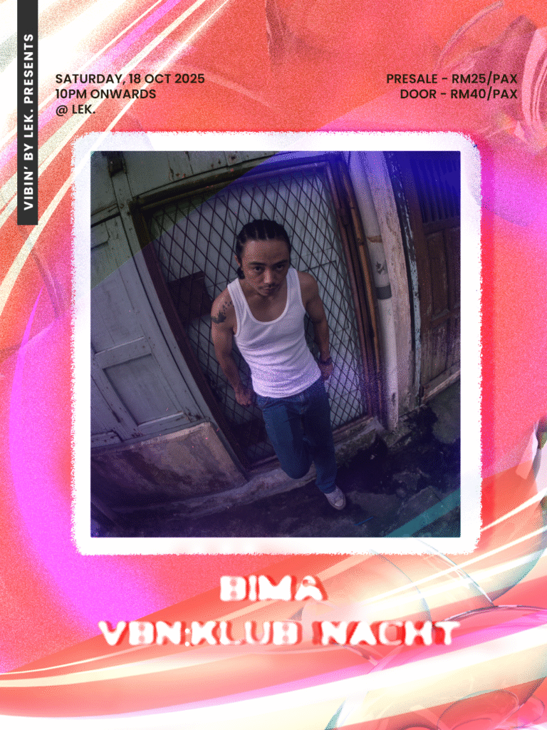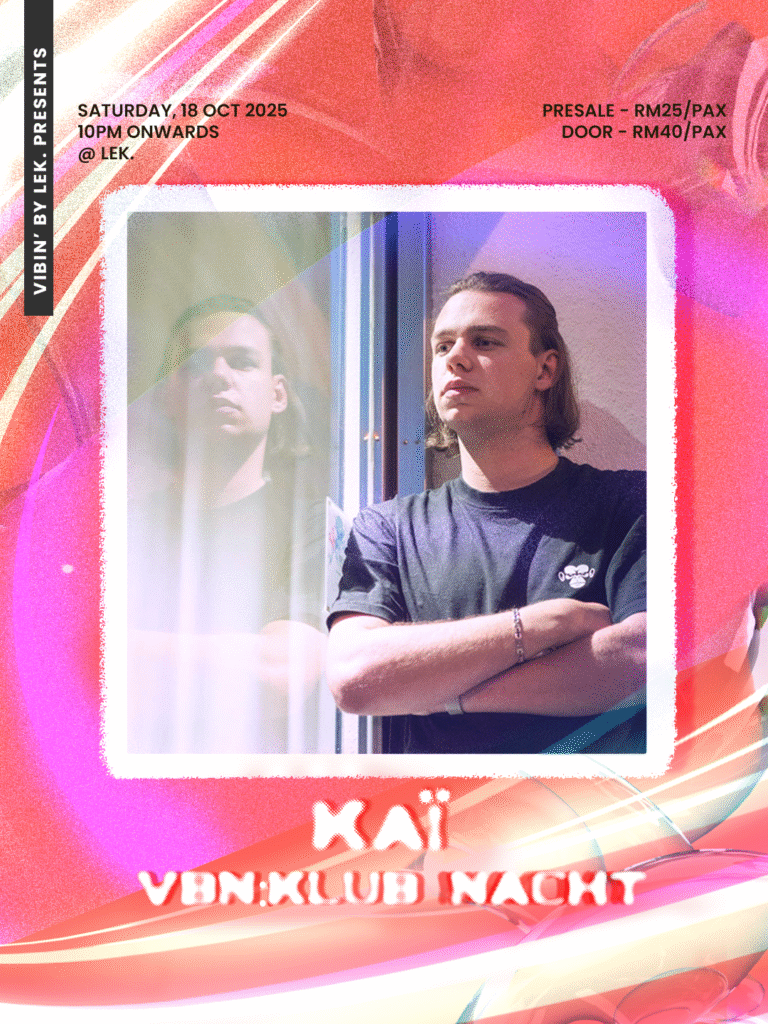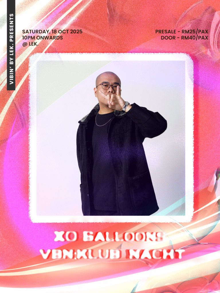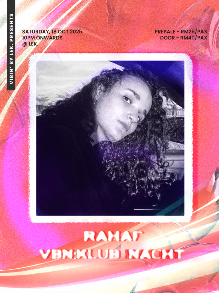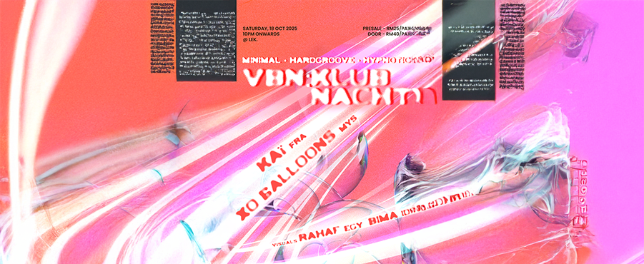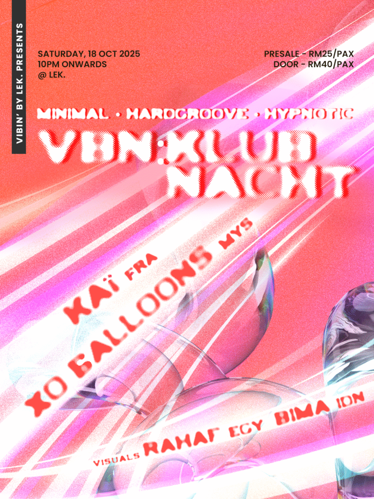Malam Techno, kembali lagi di ruang acara Lek. pada 18 October 2025(Sabtu), bermula dari jam 10.00pm sampai habis! Tiket dijual pada harga RM25 untuk pre-sale dan RM40 di hadapan pintu. Acara yang dinamakan VBN: KLUBNACHT ini yang di bawa oleh VIBIN’ by Lek. kembali dengan Dj-Dj yang akan memainkan muzik elektronik di dalam bunyi-bunyian Techno di alam Minimal, Hardgroove, dan Hypnotic. Dj-Dj yang akan mengawal lantai tarian nanti adalah XO 6alloons dan KAÏ. Malam ini juga akan memaparkan permainan visual daripada Bima Tanaka dan juga Rahaf.