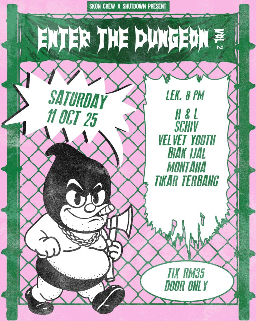 Sebuah gig Enter The Dungeon 2 bakal berlangsung di ruang acara Lek. akan berlangsung pada 11 October 2025 (Sabtu) bermula dari jam 8.00pm sampai habis! Tiket di hadapan pintu akan di jual dengan hanya RM35 sahaja. Enter The Dungeon 2 kali ini dengan anjuran Skon Crew, akan berkolaberasi dengan SHUTDOWN KCH di mana gig kali ini akan menggabungkan band-band yang bermain denga genre irama Hardcore dan juga Hip-Hop.