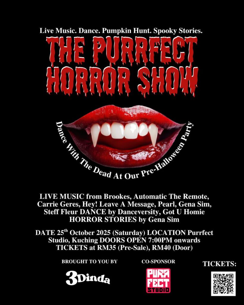 Gig Halloween bakal berlangsung di Purrfect Studio Kuching, Sarawak pada 25 Oktober 2025 (Sabtu), bermula dari jam 7.00pm sampai habis! Gig ini dianjurkan oleh 3Dinda dan bersempena dengan bulan Horror iaitu bulan sambutan Halloween, gig ini dinamakan The Purrfect Horror Show. Dengan tagline ‘Dance With The Dead‘, gig ini merupakan prelude untuk Pre-Halloween Party dan menjanjikan suasana yang di penuhi dengan music, persembahan, keunikan Kuching yang penuh dengan kepelbagaian di dalam scene kreatif.